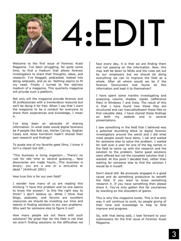 3. I already made the commitment to be an author who regularly commitments original technical content for a community supported DFIR magazine. I even recently completed my first article for ITB. I mention this to show my perspective is coming from as an author. I have to agree with Harlan about trying to join the ITB and 4cast magazine projects together. Both projects have similar goals (as outlined on both blogs) and both will have similar content.